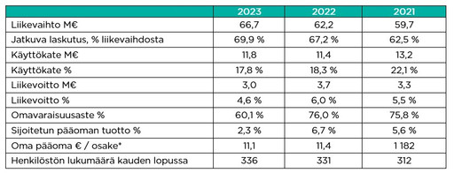 Liiketoiminnan rahavirta tilikaudella 1.1.-31.12.2023 oli 10,9 (11,6) M€. Heikentyneeseen liiketoiminnan rahavirtaan vaikutti korkeammat rahoituskulut verrattuna edelliseen tilikauteen. Konsernin taseen loppusumma oli 191,8 (155,5) M€. Käyttöomaisuusinvestoinnit rahoitettiin tulorahoituksen lisäksi likvidiä sijoitusomaisuutta realisoimalla sekä lisäämällä pitkäaikaista vierasta pääomaa. Konsernin omavaraisuusaste tilikauden lopussa oli 60,1 (76,0) %. Oma pääoma osaketta kohden oli 11,1 (11,4) €.
