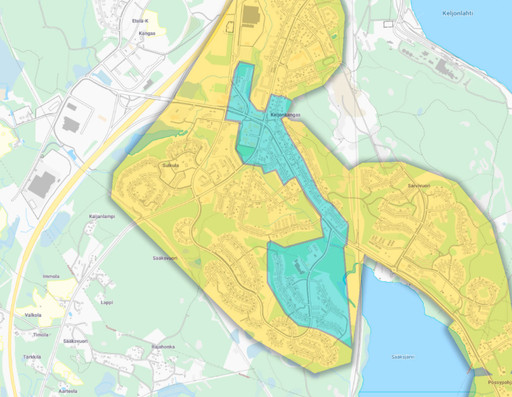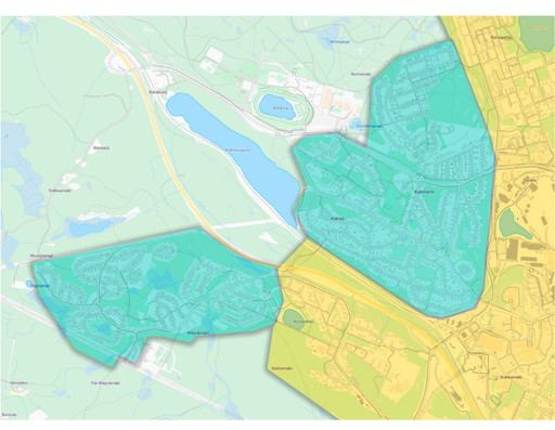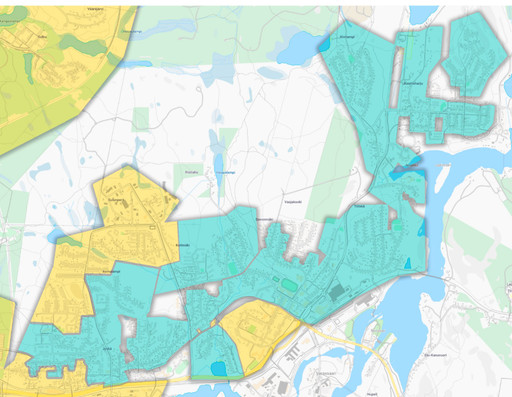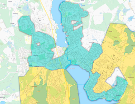 Jyväskylän rakennuspäätösalueet turkoosilla ja muut myynnissä olevat alueet keltaisella.