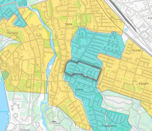 Uudet rakennusalueet kartassa sinisellä, muut myynnissä olevat alueet keltaisella: